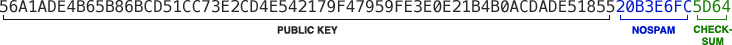The last 6 bytes at the end of Tox ID are used for spam prevention and can be changed on Tox ID holder's whim. If we get many spammy friend requests, we can just change last 6 bytes of our Tox ID and the friend requests for Tox ID with the previous 6 bytes won't get through anymore. In order to receive a friend request, our new Tox ID should be used (the one with updated last 6 bytes). These 6 bytes can be thought of as a password, which should be known in order to be able to send us a friend request. Technically, we have direct control only of the first 4 bytes out of these 6 spam prevention bytes. These first 4 bytes are called “nospam”. The remaining 2 bytes are just a checksum, used for a simple check of whether Tox ID is valid. The first byte of the checksum is a XOR of all even bytes if the public key and nospam, while the second byte is XOR of all odd bytes of them.